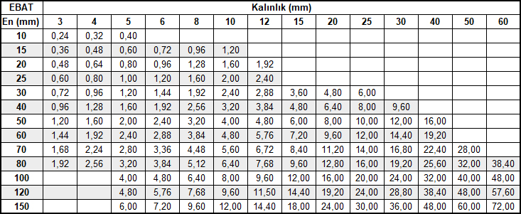 PASLANMAZ LAMA AĞIRLIK TABLOSU